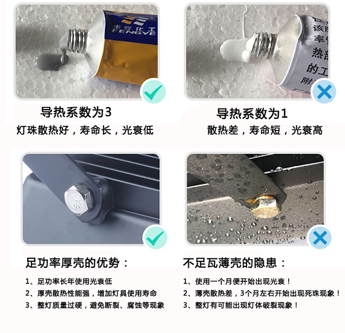 1.光源采用進口LED投光燈COB光源,高亮度,壽命長,通透率高,顏色純正無頻閃。大功率2.外殼采用加高加厚優(yōu)質(zhì)航空鋁材散熱鋁材,大幅度提升LED投光燈散熱性能。